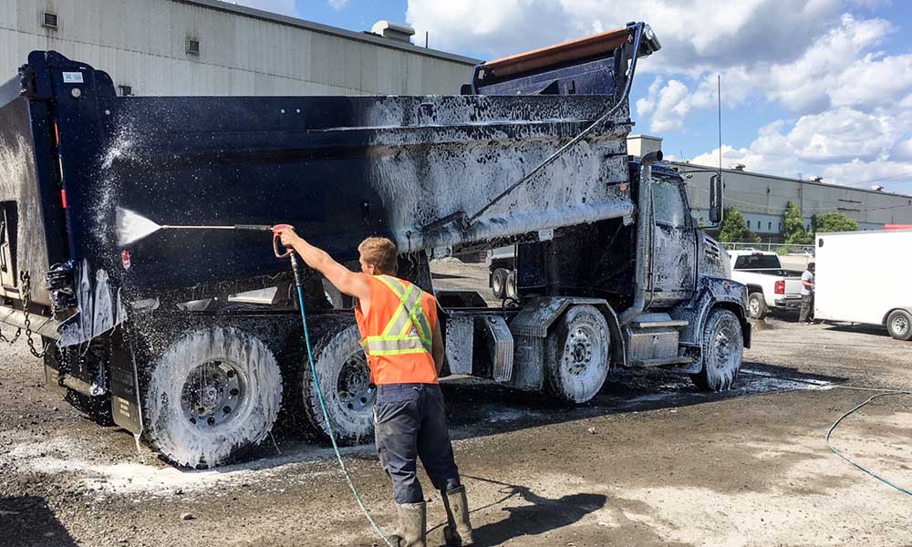Cleaning and pressure washing one of their dump trucks after a dirty job